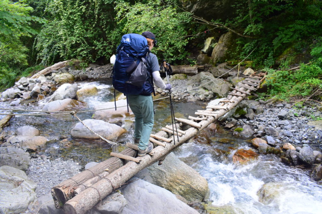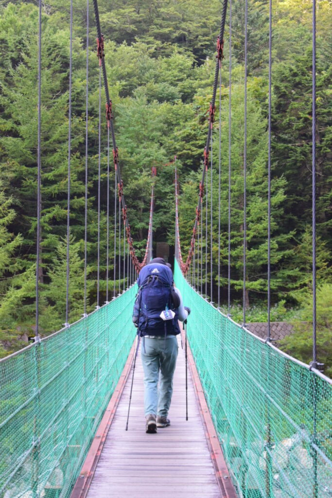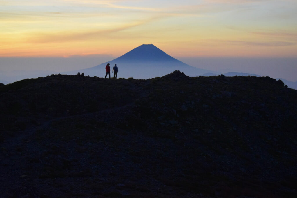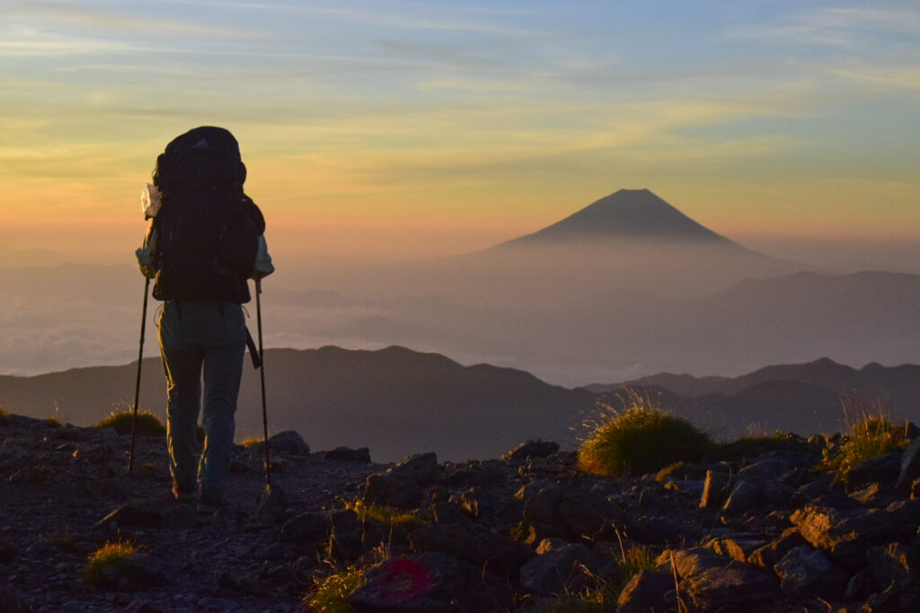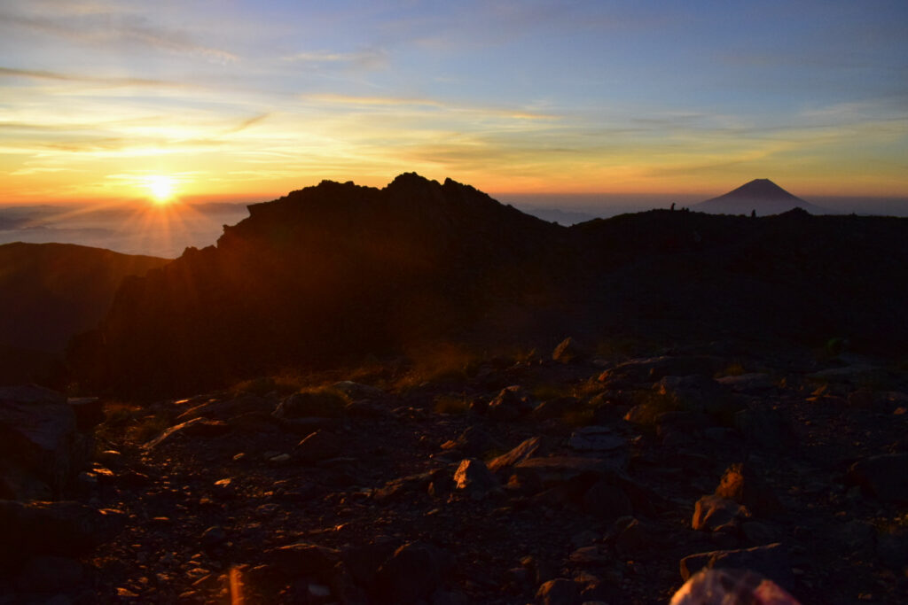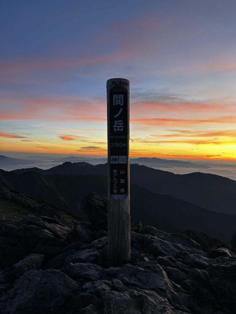 8/30 3:10 北岳山荘発。風があり寒い。フリースを2枚着て歩く。4:50 東の空が朝焼けに染まる。5:00 間ノ岳着。御来光を拝みに来ている登山者が集う。5:13 御来光。雲海の奥から光が差し込む。5:20 間ノ岳発。富士山に向かうように歩き出す。とてもいいアングルで思わず撮影する。逆光で先輩の背中がシルエットとなり格好いい。いい一枚が撮れた。稜線歩きは下りと登りを繰り返す。6:30 農鳥小屋着。噂のスライダー式トイレを使用。使用後は入り口にあるドラム缶に入った水を柄杓ですくい、スライダー便器に流す。なんとも原始的であった。売店は7:00から営業。水の販売もあった。7:00 農鳥小屋発。8:00 西農鳥岳着。9:00 農鳥岳着。10:17 大門沢下降点着。急坂を降りる。標高が下がるにつれて暑くなる。13:20 大門沢小屋着。ここで先輩がコーラを購入。とても美味しそうに飲む。予定よりも早めの到着だったため、泊まらずに下山することとした。大門沢小屋からの下山道には丸太橋があり、一部腐っているところがあった。最後の吊り橋は左右への揺れが強く、ワイヤーを持ちながら慎重に渡る。17:15 第一発電所バス停に到着。バス停には登山者が数名待機している。あと4分後にバスが来るとのこと。我々は最後まで歩き抜こうとの話になり、バスには乗らずに歩くこととした。18:00 奈良田駐車場着。15時間という長い道のりだったが、絶景のお陰でそこまで長くは感じなかった。18:10 女帝の湯で入浴。700円。湯はとろみがあり肌触りがいい。ギリギリまで湯に浸かり19時に温泉をあとにする。20:10 コンビニでアイスをご馳走になる。21:10 釈迦堂PAで味噌ラーメンを食べる。疲れた体に塩分が染みる。途中で眠くなり20分ほど仮眠をとる。0:05 津田沼着。