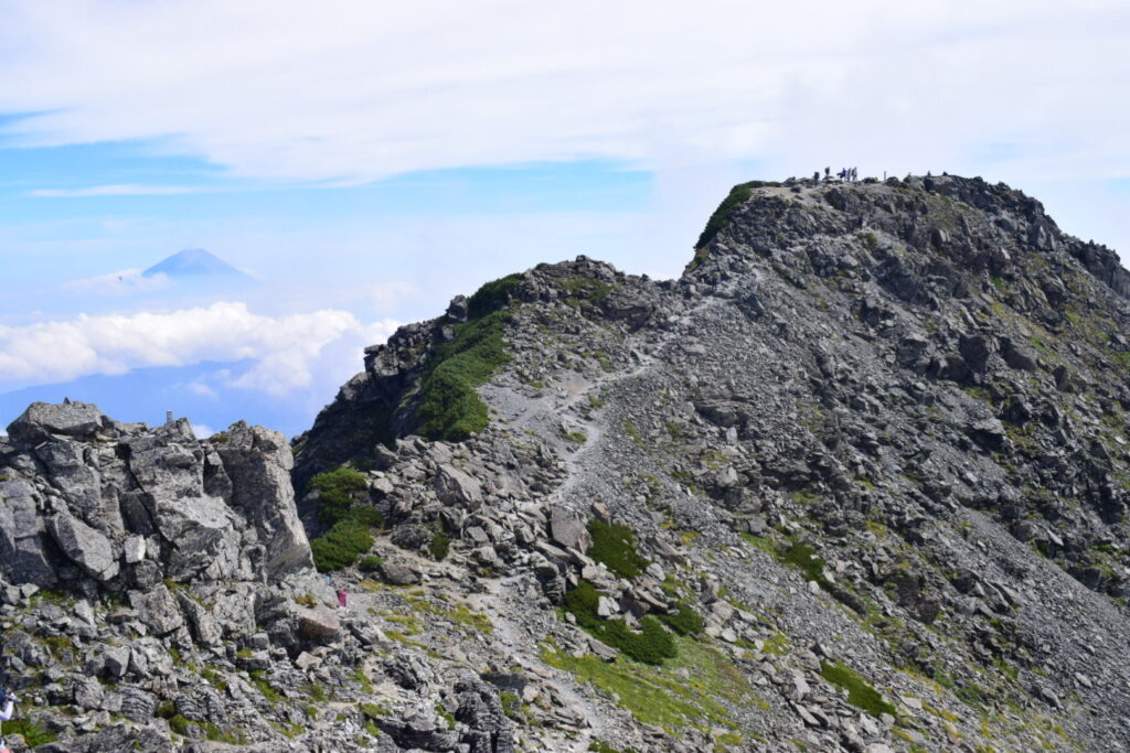 8/29 0:40 津田沼発。中央道を経由して甲府南ICで降りる。3:50 奈良田駐車場着。4:30にバス停に並ぶ。我々は2番目。その後すぐに行列となる。金曜日でこの混み具合。5:10 バスに乗車して奈良田を出発。運賃は1300円と協力金300円で合計1600円。現金のみ。6:20 広河原着。芦安からの登山者も多くトイレは混み合っている。6:45 広河原発。天気は快晴。急登の樹林帯を歩く。9:00 白根御池小屋着。無料の水場で水を汲む。30分ほど休憩する。草すべりからは日陰が少なくなり暑い。聞いてたほどの急登ではなく、それほど長くもない。稜線に上がると、仙丈ヶ岳や甲斐駒ヶ岳が現れる。12:15 北岳肩の小屋着。「北岳に来ただけ」看板の前で記念撮影してから出発。13:20 北岳山頂着。記念撮影をして13:40 山頂発。14:40 北岳山荘着。小屋で受付を済ませる。テント場は受付前に確保しといたほうがよさそう。山荘内にはWi-Fiあり。auのみ無料、その他キャリアは2時間300円、24時間600円。Wi-Fiに繋げると翌日の大門沢小屋でも自動でWi-Fiに繋がった。テント場に戻り富士山を拝む。19:00 就寝。